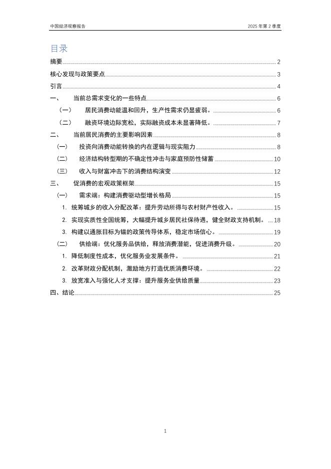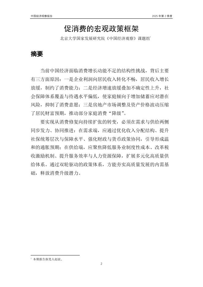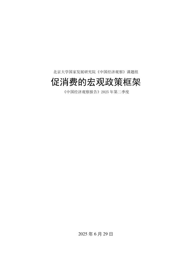 1、打开文档需要使用基本的办公软件,如Word、Office、WPS、Pdf、Cad、Rar、Zip等。 2、如遇下载失败、解压失败、文档缺失等问题,请通过【反馈】按钮提交。北京大学国家发展研究院:《中国经济观察报告》2025 年第二季度促消费的宏观政策框架.pdf