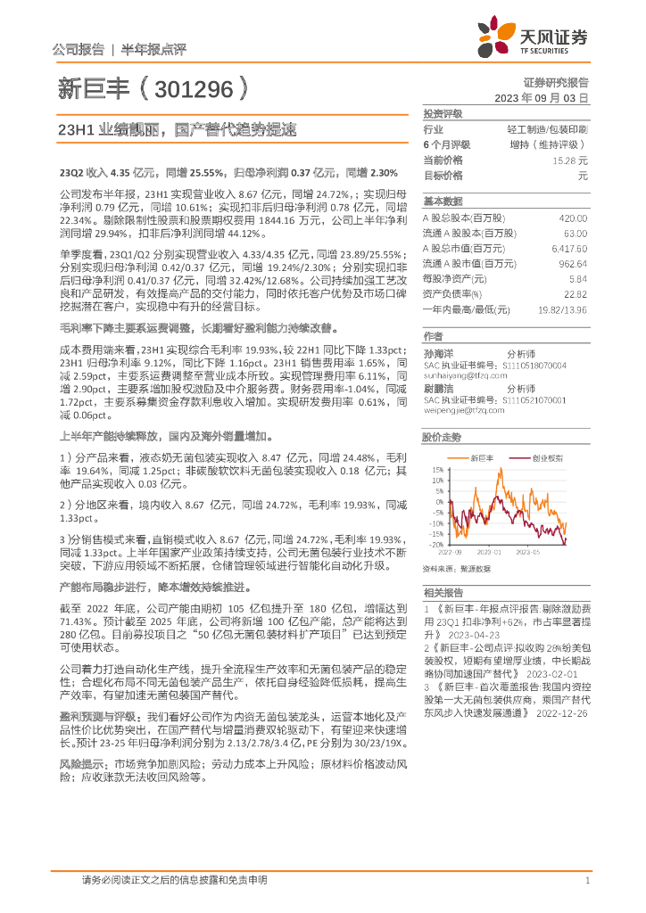 天风证券:新巨丰(301296)-23H1业绩靓丽,国产替代趋势提速.pdf