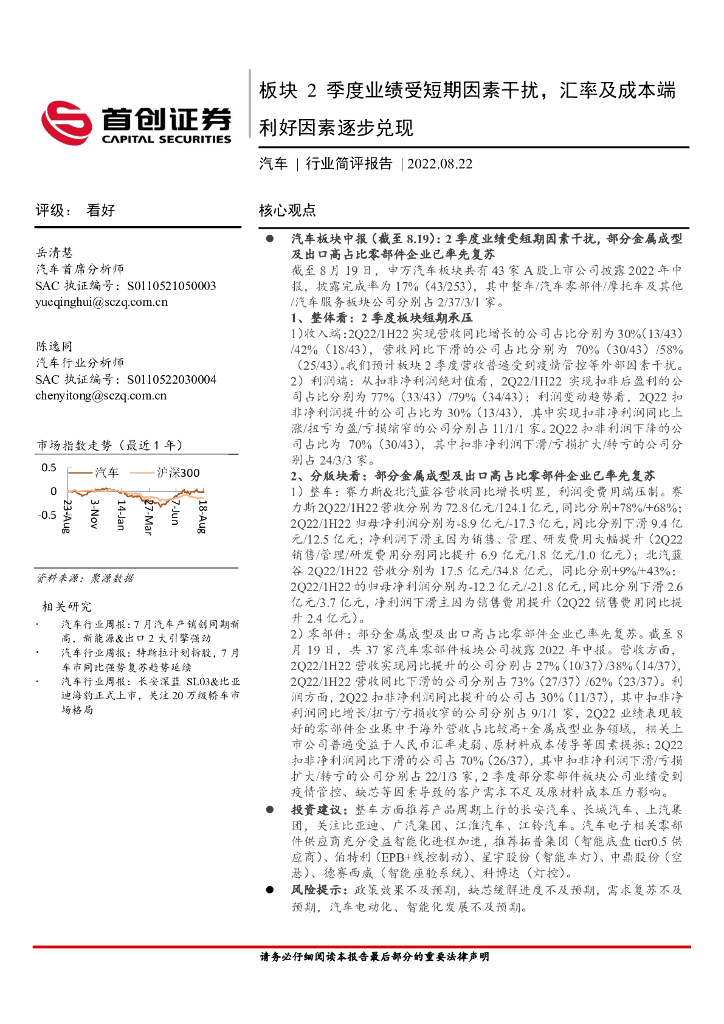 首创证券:汽车行业简评报告:板块2季度业绩受短期因素干扰,汇率及成本端利好因素逐步兑现.pdf