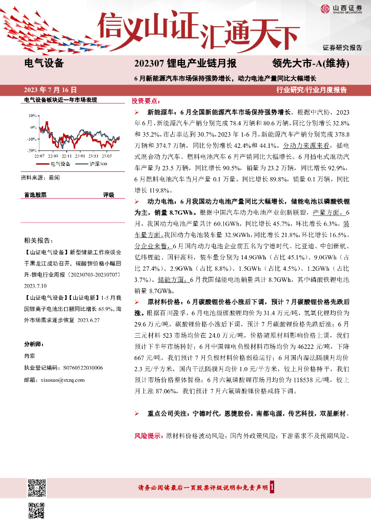 山西证券:锂电产业链月报:6月新能源汽车市场保持强势增长,动力电池产量同比大幅增长.pdf