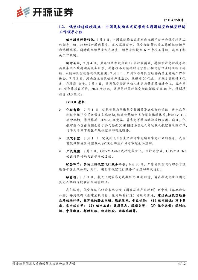 开源证券:电力设备行业周报:低空经济行业周报(第三十六期):中国移动主导首个低空经济共享设备标准立项,多地低空经济支持政