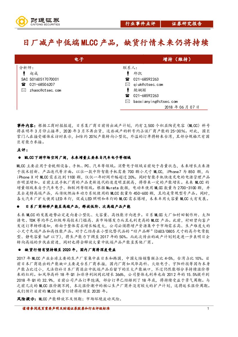 财通证券:电子行业事件点评:日厂减产中低端MLCC产品,缺货行情未来仍将持续.pdf