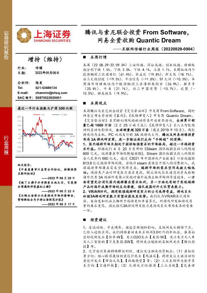 上海证券:互联网传媒行业周报:腾讯与索尼联合投资From Software,网易全资收购Quantic Dream.pdf