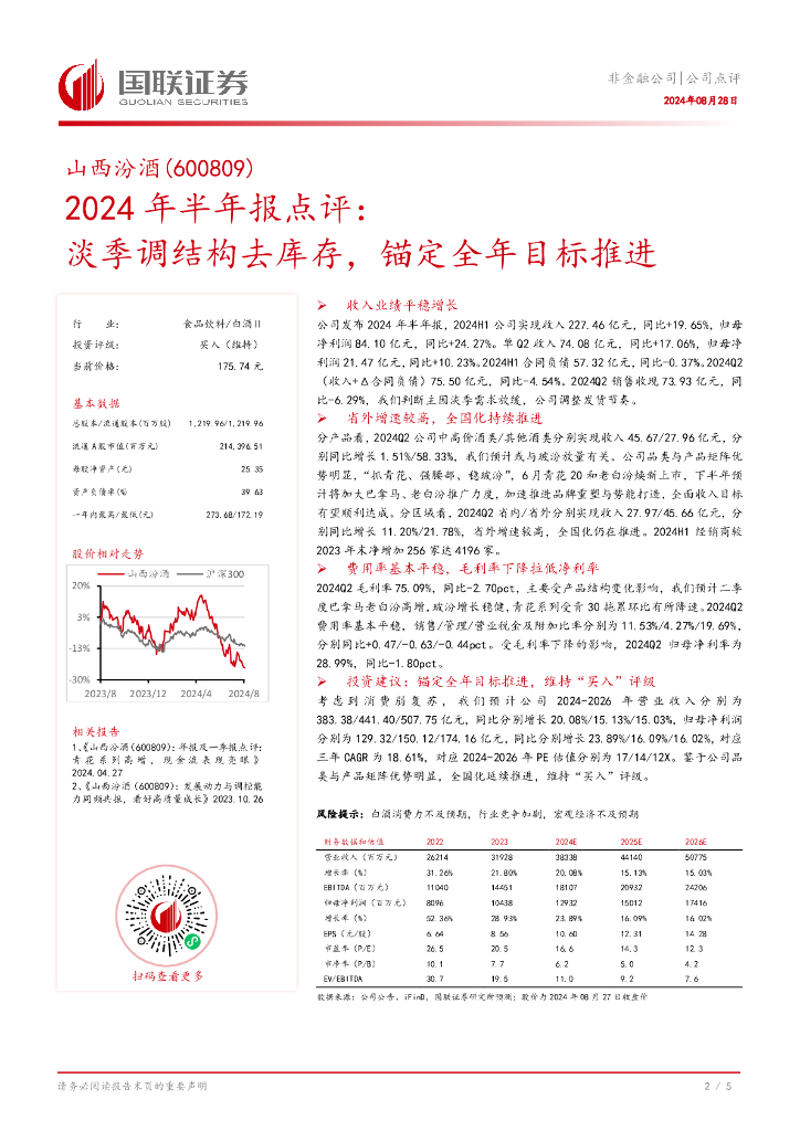 国联证券:山西汾酒(600809)-2024年半年报点评:淡季调结构去库存,锚定全年目标推进.pdf