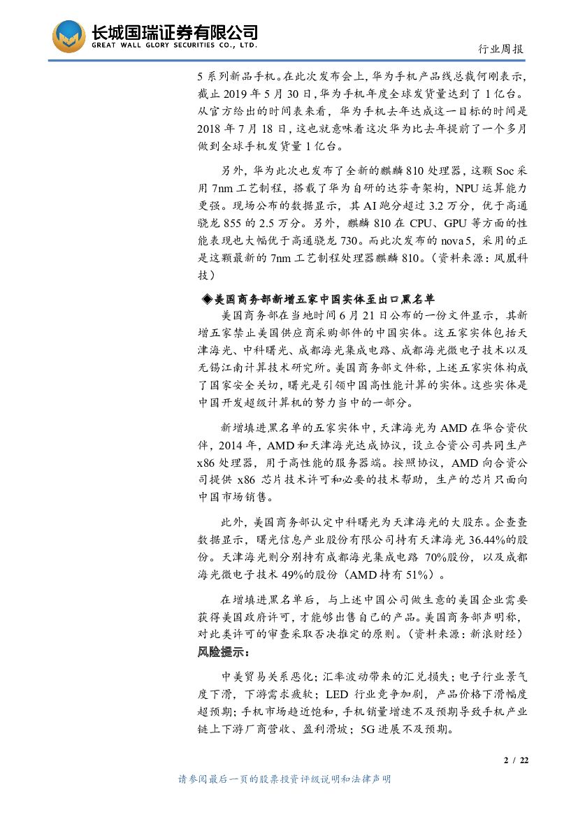 长城国瑞证券:电子行业双周报2019年第12期(总第12期):中美贸易摩擦仍存不确定性,持续关注芯片国产替代化进程.pdf