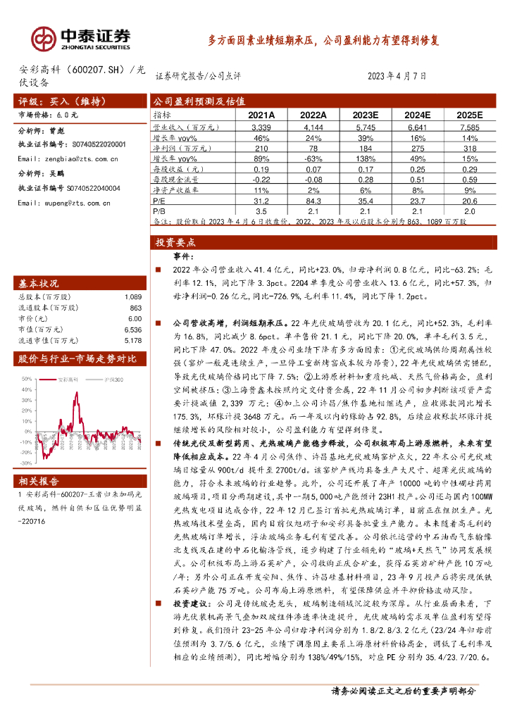 中泰证券:安彩高科(600207)-多方面因素业绩短期承压,公司盈利能力有望得到修复.pdf