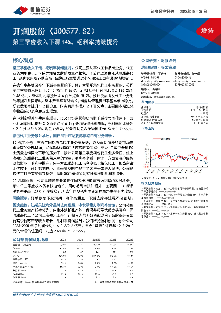 国信证券:开润股份(300577)-第三季度收入下滑14%,毛利率持续提升.pdf