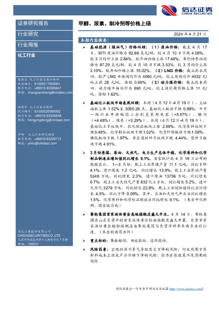 信达证券:化工行业行业周报:化工行业周报:甲醇、尿素、制冷剂等价格上扬.pdf