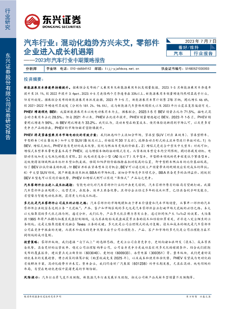 东兴证券:2023年汽车行业中期策略报告:混动化趋势方兴未艾,零部件企业进入成长机遇期.pdf