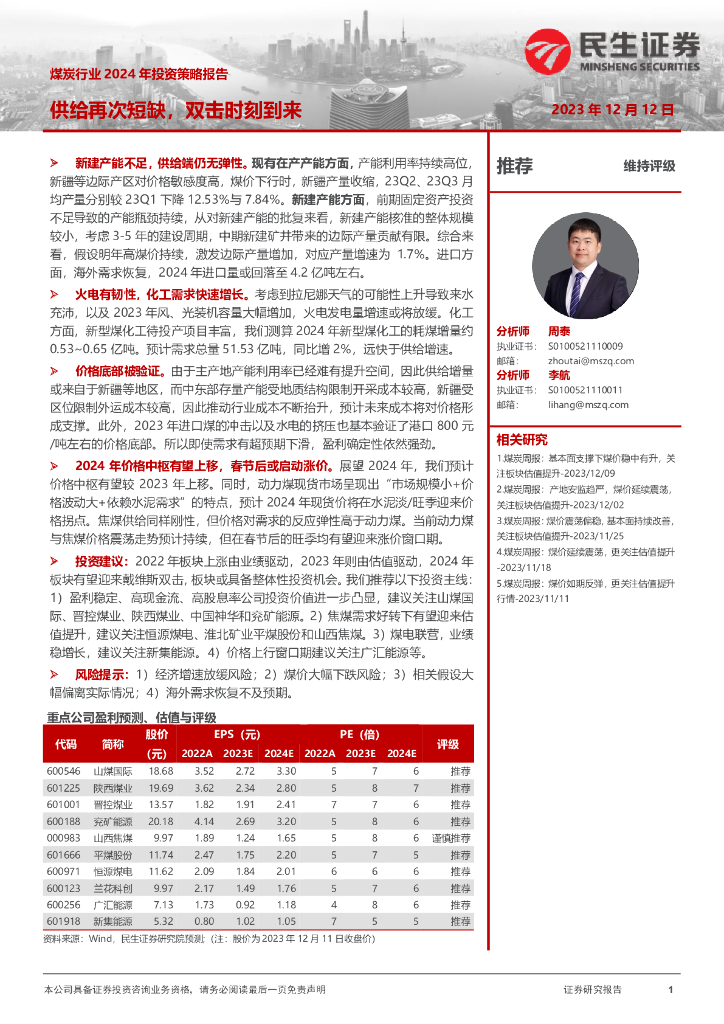 民生证券:煤炭行业2024年投资策略报告:供给再次短缺,双击时刻到来.pdf