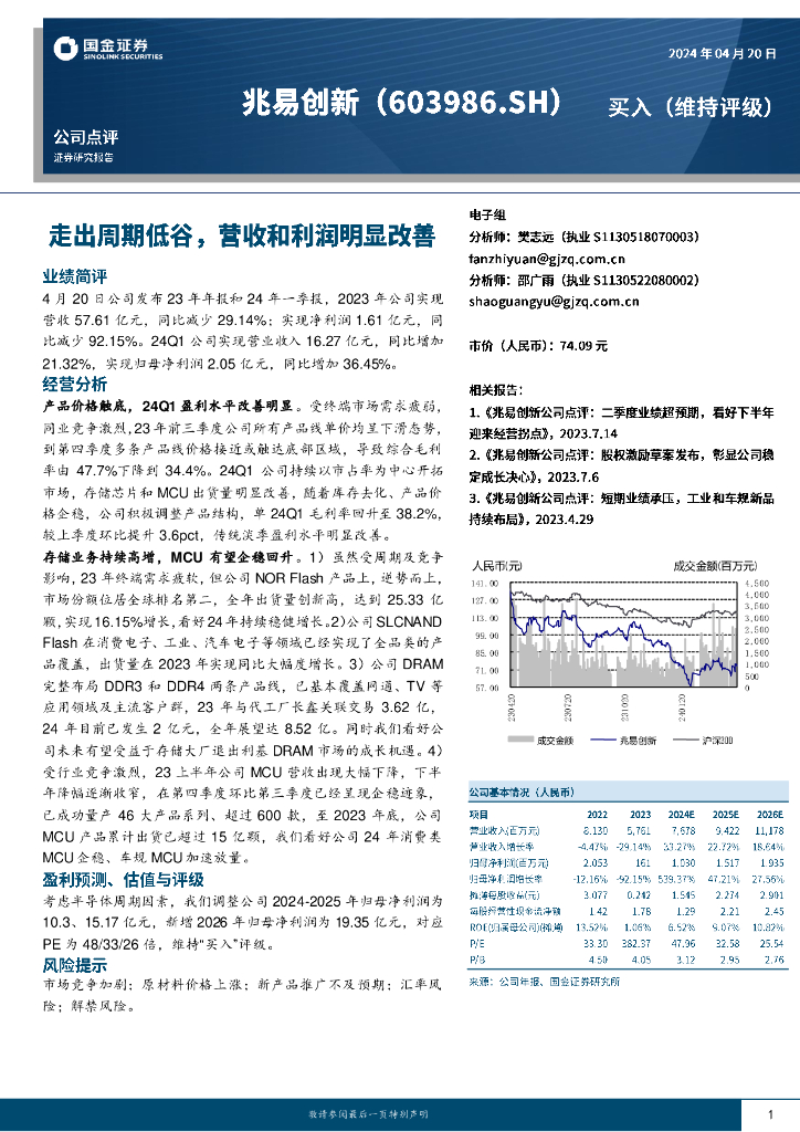 国金证券:兆易创新(603986)-走出周期低谷,营收和利润明显改善.pdf
