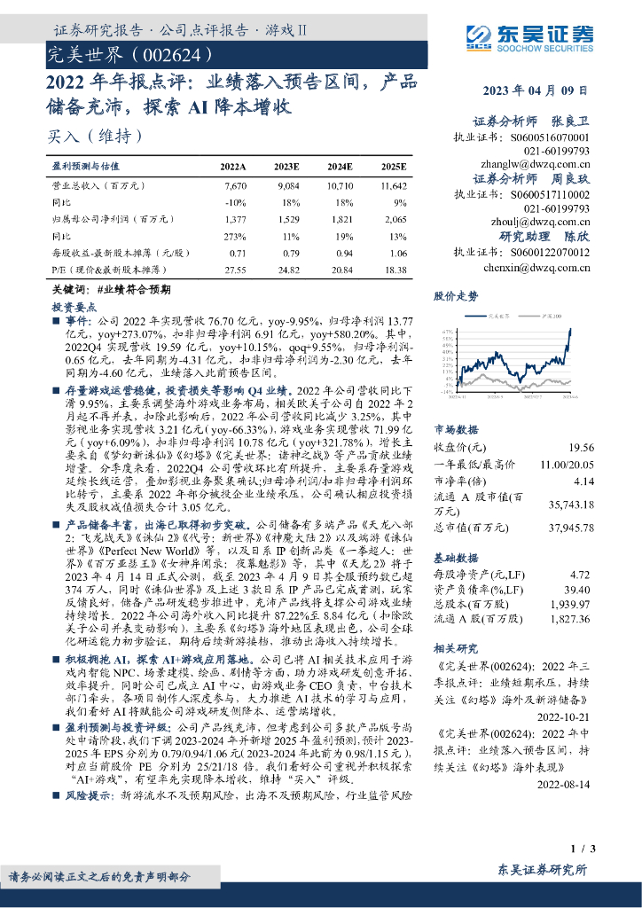 东吴证券:完美世界(002624)-2022年年报点评:业绩落入预告区间,产品储备充沛,探索AI降本增收.pdf