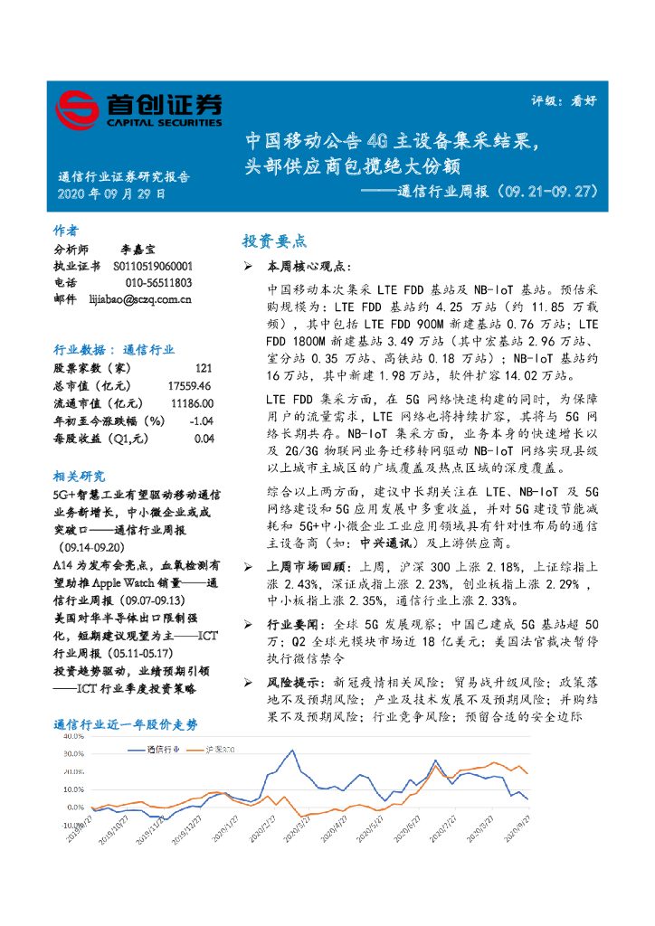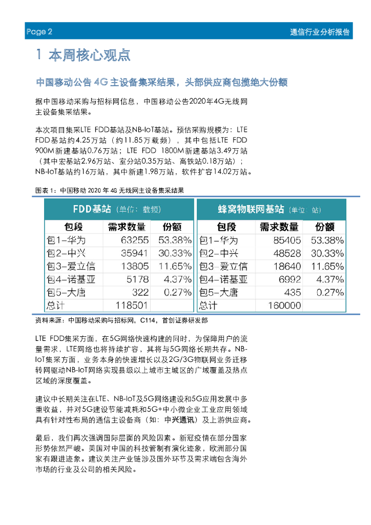 首创证券:通信行业周报:中国移动公告4G主设备集采结果,头部供应商包揽绝大份额.pdf