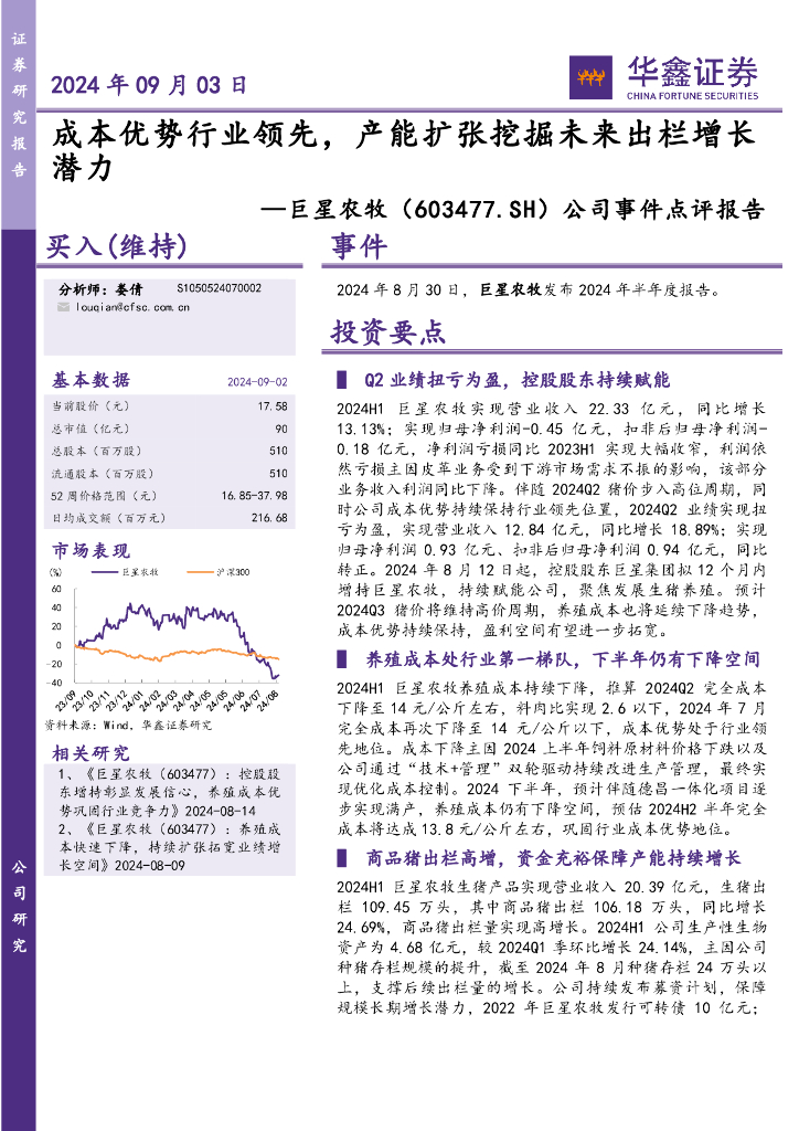 华鑫证券:巨星农牧(603477)-公司事件点评报告:成本优势行业领先,产能扩张挖掘未来出栏增长潜力.pdf