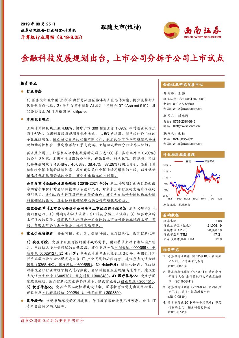 西南证券:计算机行业周报:金融科技发展规划出台,上市公司分拆子公司上市试点.pdf