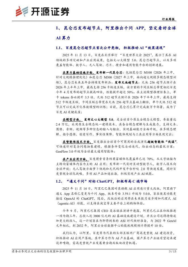 开源证券:通信行业周报:昆仑芯发布超节点,阿里推出千问APP,坚定看好全球AI算力.pdf
