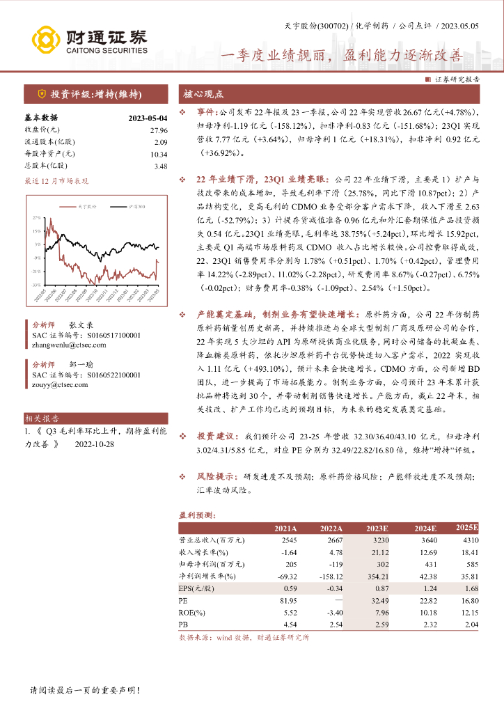 财通证券:天宇股份(300702)-一季度业绩靓丽,盈利能力逐渐改善.pdf