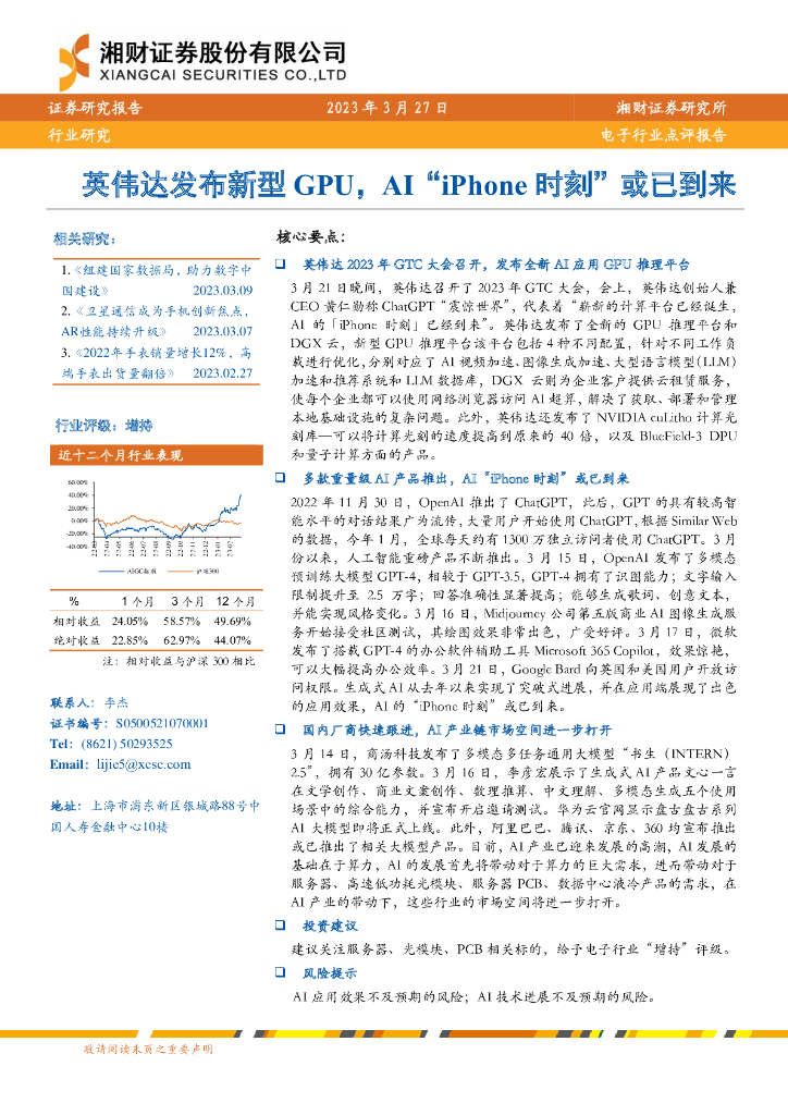 湘财证券:电子行业点评报告:英伟达发布新型GPU,AI“iPhone时刻”或已到来.pdf