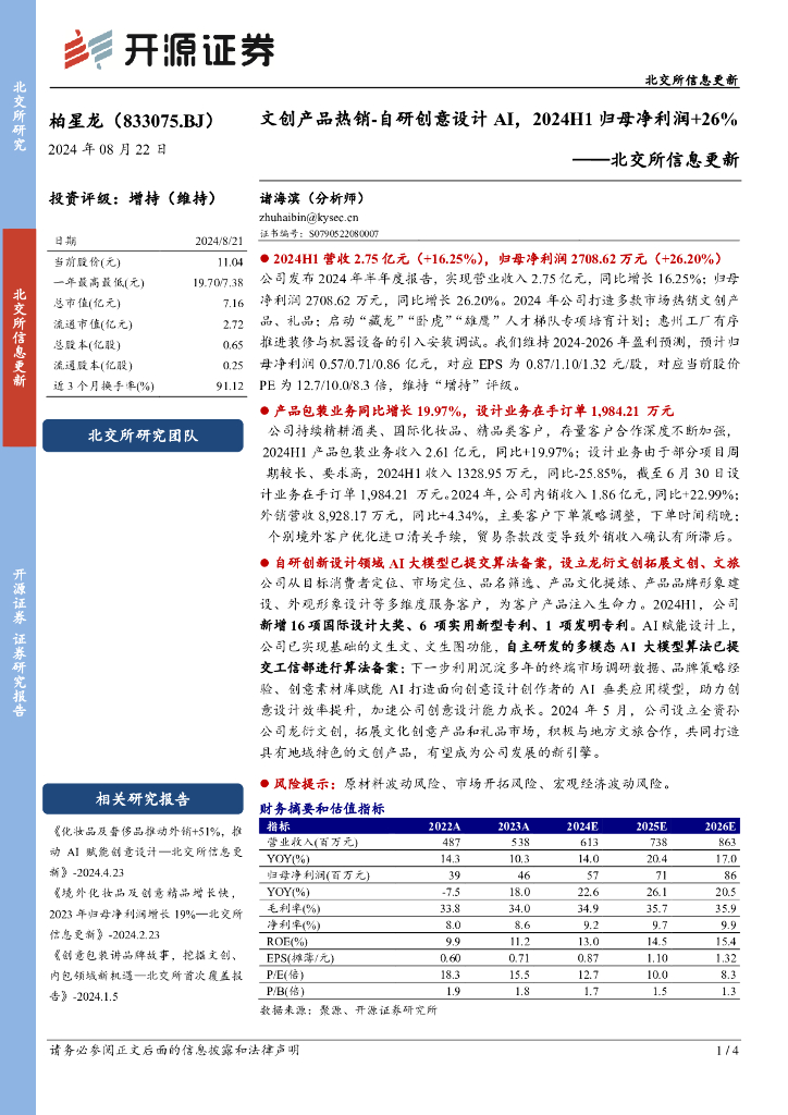 开源证券:柏星龙(833075)-北交所信息更新:文创产品热销-自研创意设计AI,2024H1归母净利润+26%.pdf