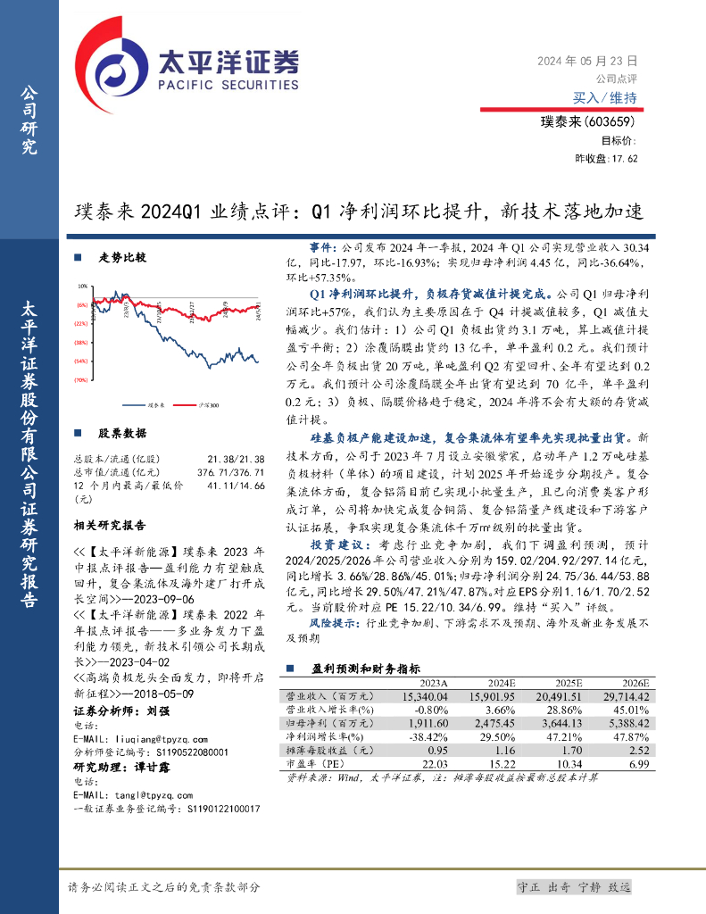 太平洋证券:璞泰来2024Q1业绩点评:Q1净利润环比提升,新技术落地加速.pdf