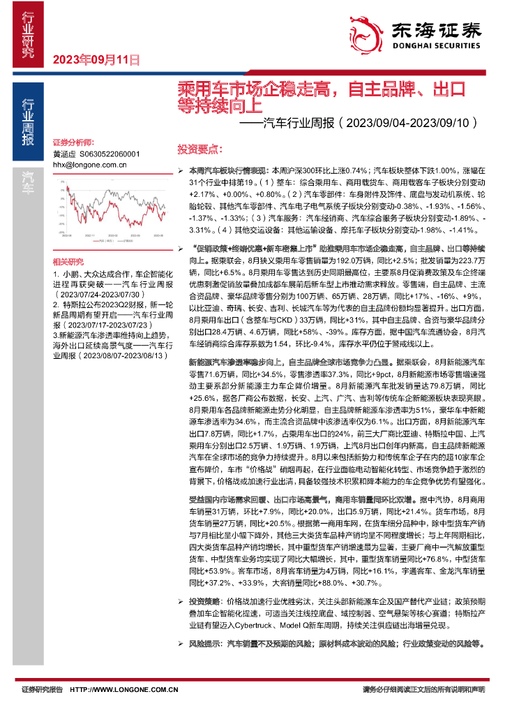 东海证券:汽车行业周报:乘用车市场企稳走高,自主品牌、出口等持续向上.pdf