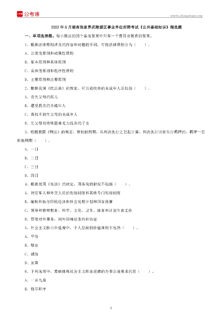 2022年6月湖南张家界武陵源区事业单位招聘考试《公共基础知识》精选题.pdf