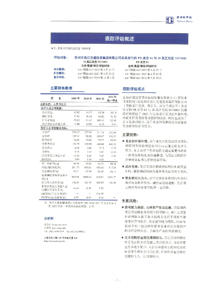 新世纪:苏州市吴江交通投资集团有限公司及其发行的PR吴交01与20吴江交投MTN001跟踪评级报告.pdf
