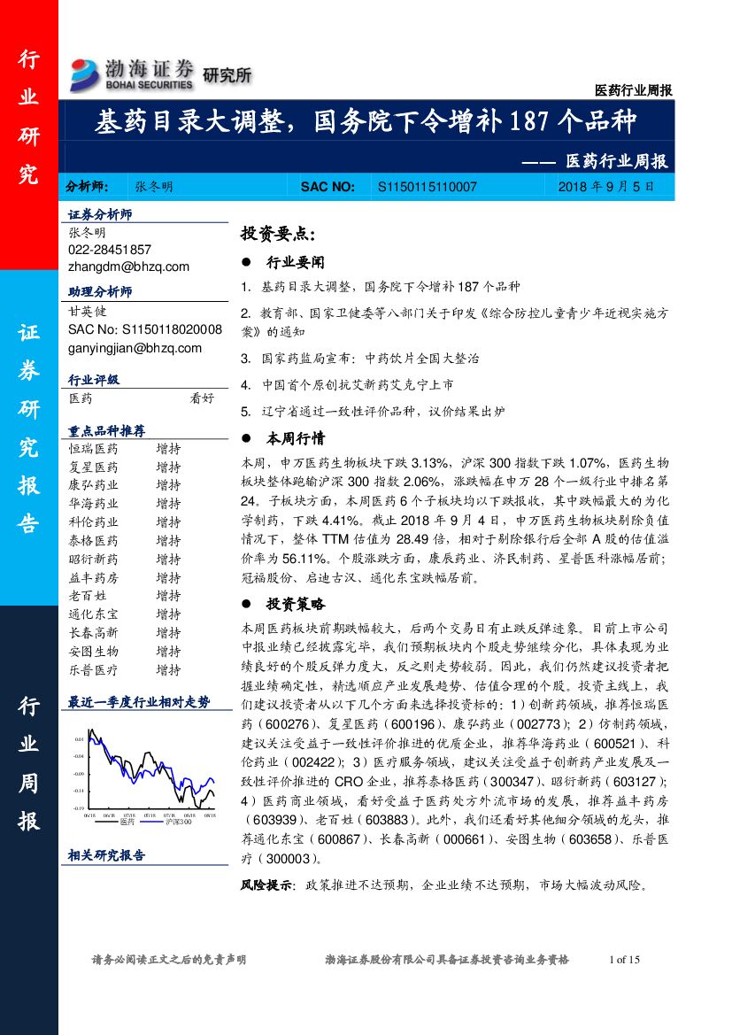 渤海证券:医药行业周报:基药目录大调整,国务院下令增补187个品种.pdf