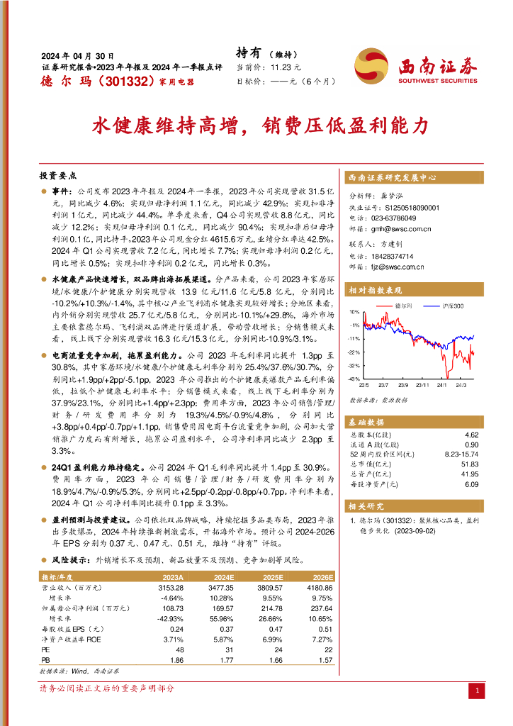 西南证券:德尔玛(301332)-水健康维持高增,销费压低盈利能力.pdf