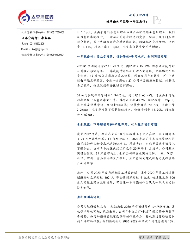 太平洋证券:桃李面包年报暨一季报点评:疫情利好迎开门红,全国扩张推进继续.pdf