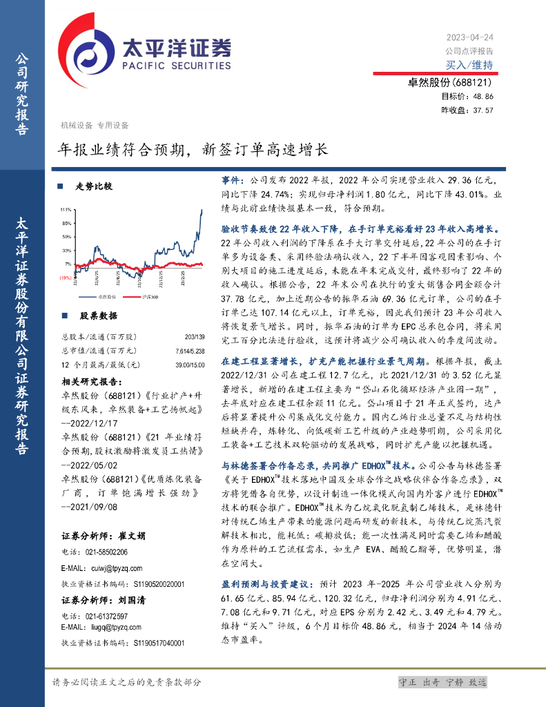 太平洋证券:卓然股份(688121)-年报业绩符合预期,新签订单高速增长.pdf