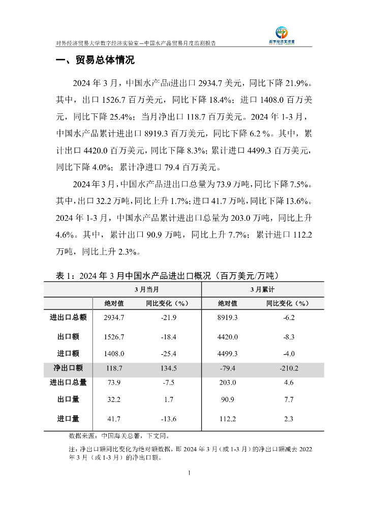 对外经济贸易大学:中国水产品贸易月度监测报告(2024年1-3月).pdf