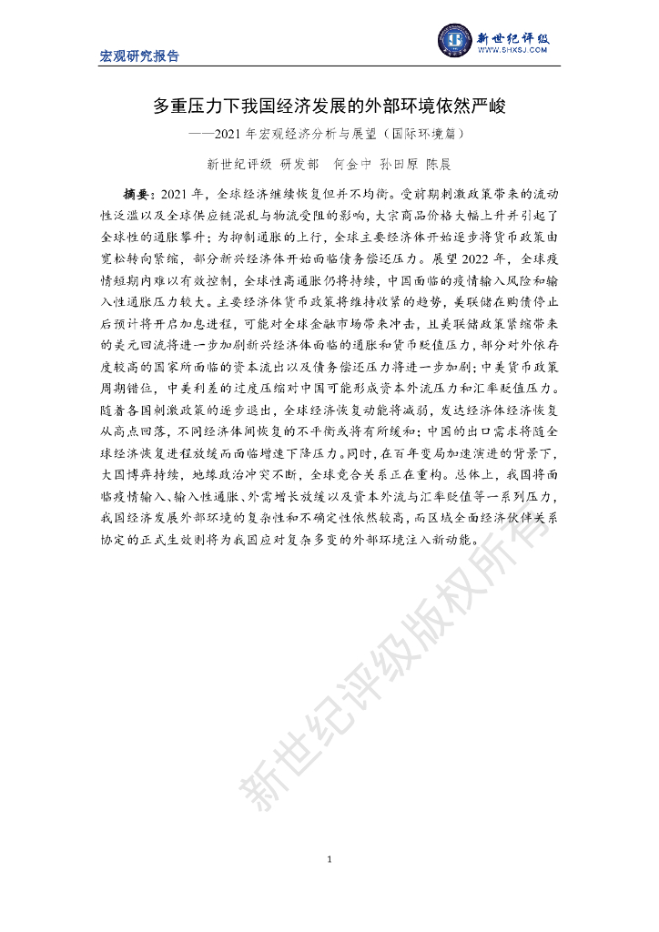 新世纪评级:多重压力下我国经济发展的外部环境依然严峻——2021年宏观经济分析与展望(国际环境篇).pdf