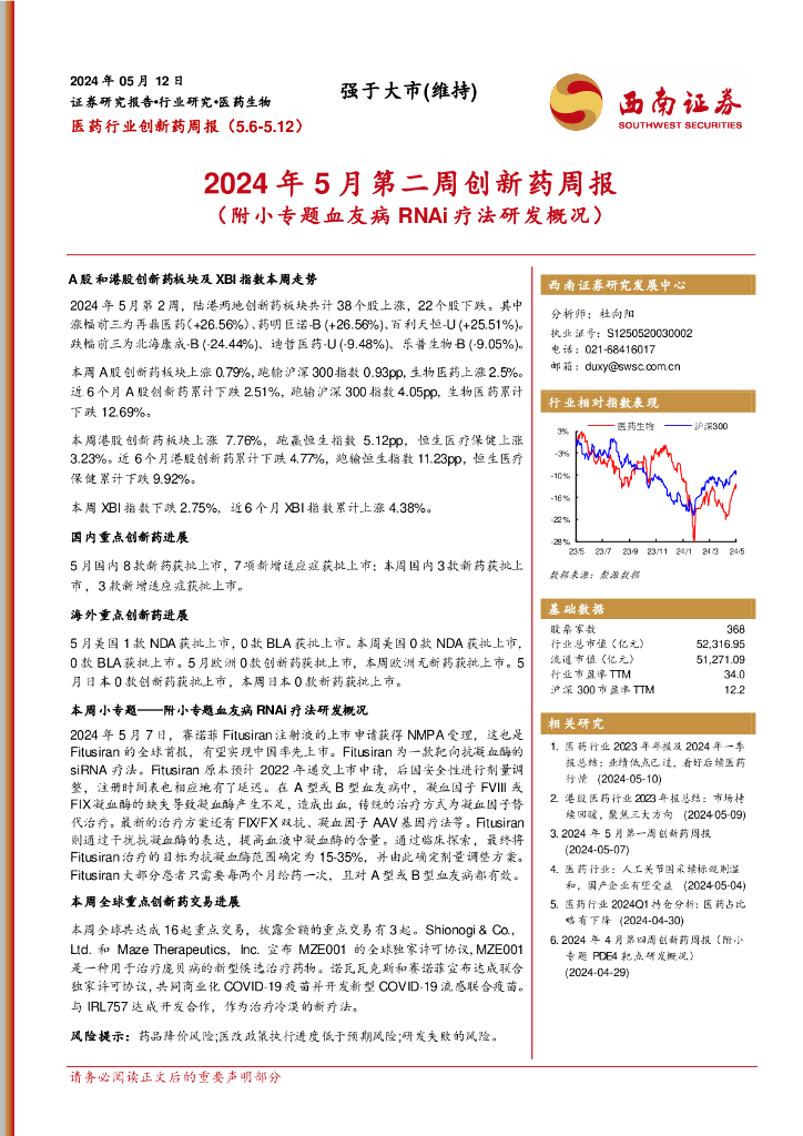 西南证券:医药行业创新药周报:2024年5月第二周创新药周报(附小专题血友病RNAi疗法研发概况).pdf