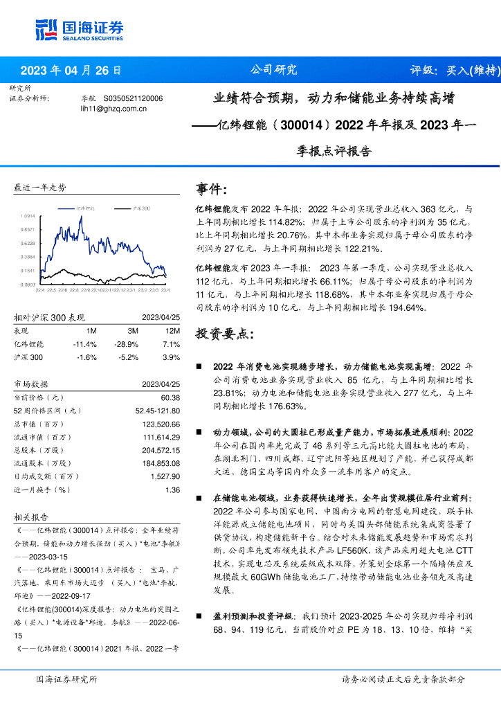 国海证券:亿纬锂能(300014)-2022年年报及2023年一季报点评报告:业绩符合预期,动力和储能业务持续高增.pdf