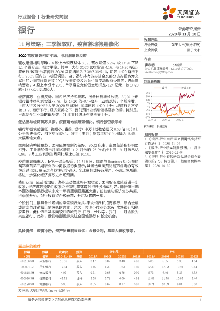 天风证券:银行11月策略:三季报较好,疫苗落地将是催化银行.pdf