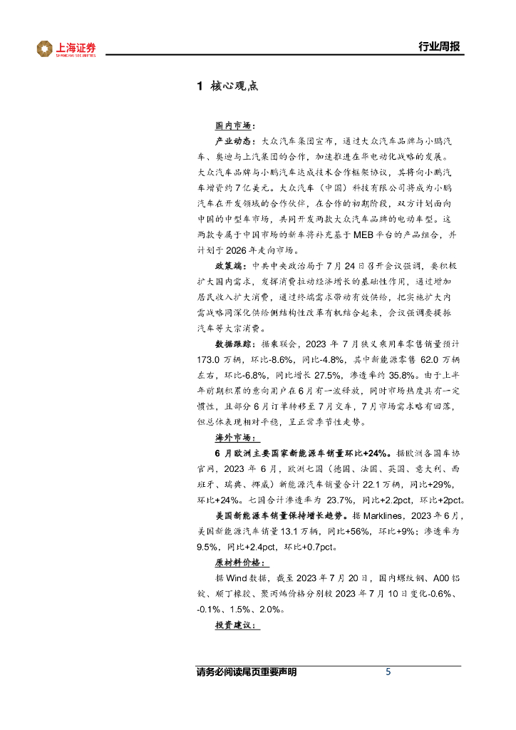 上海证券:汽车与零部件行业周报:大众小鹏开启合作新模式,政治局会议强调提振汽车等大宗消费.pdf