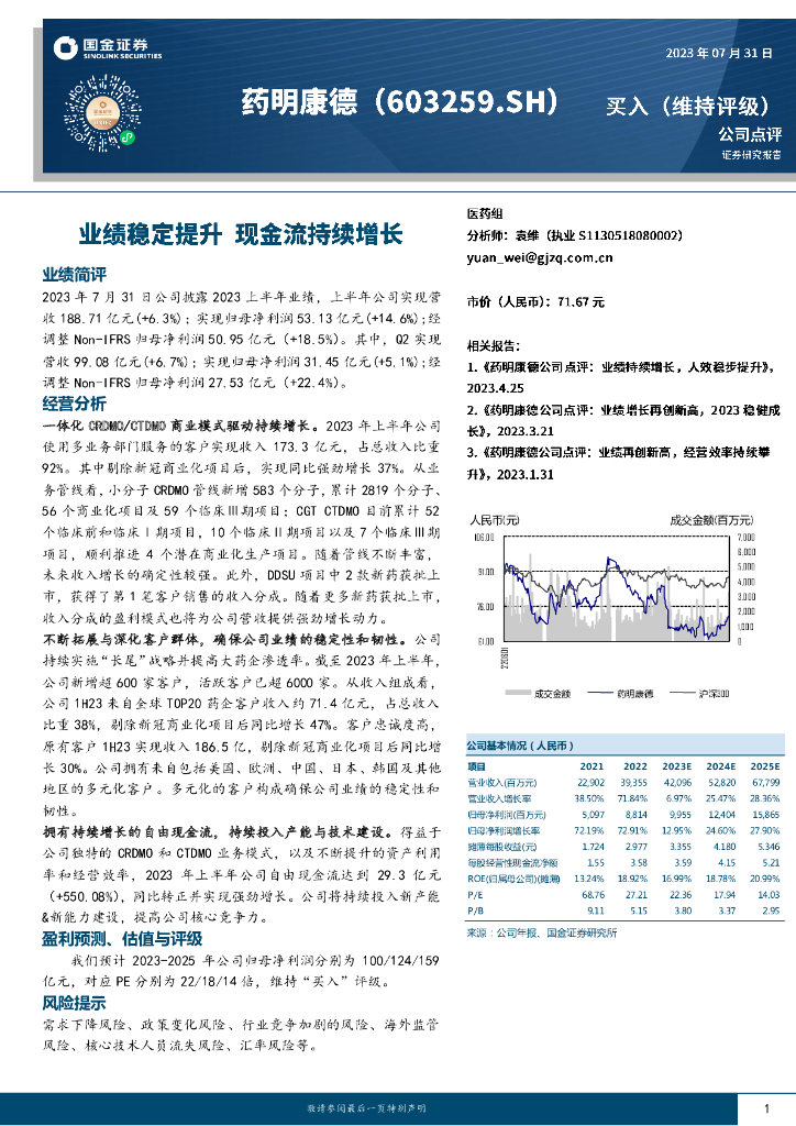 国金证券:药明康德(603259)-业绩稳定提升 现金流持续增长.pdf