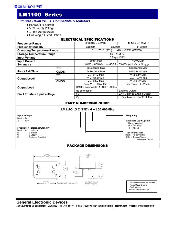 General Electronic Devices LM1100 Series Full Size HCMOS/TTL Compatible Oscillators 数据手册.pdf