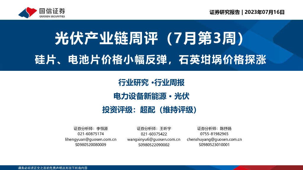国信证券:光伏产业链周评(7月第3周):硅片、电池片价格小幅反弹,石英坩埚价格探涨.pdf