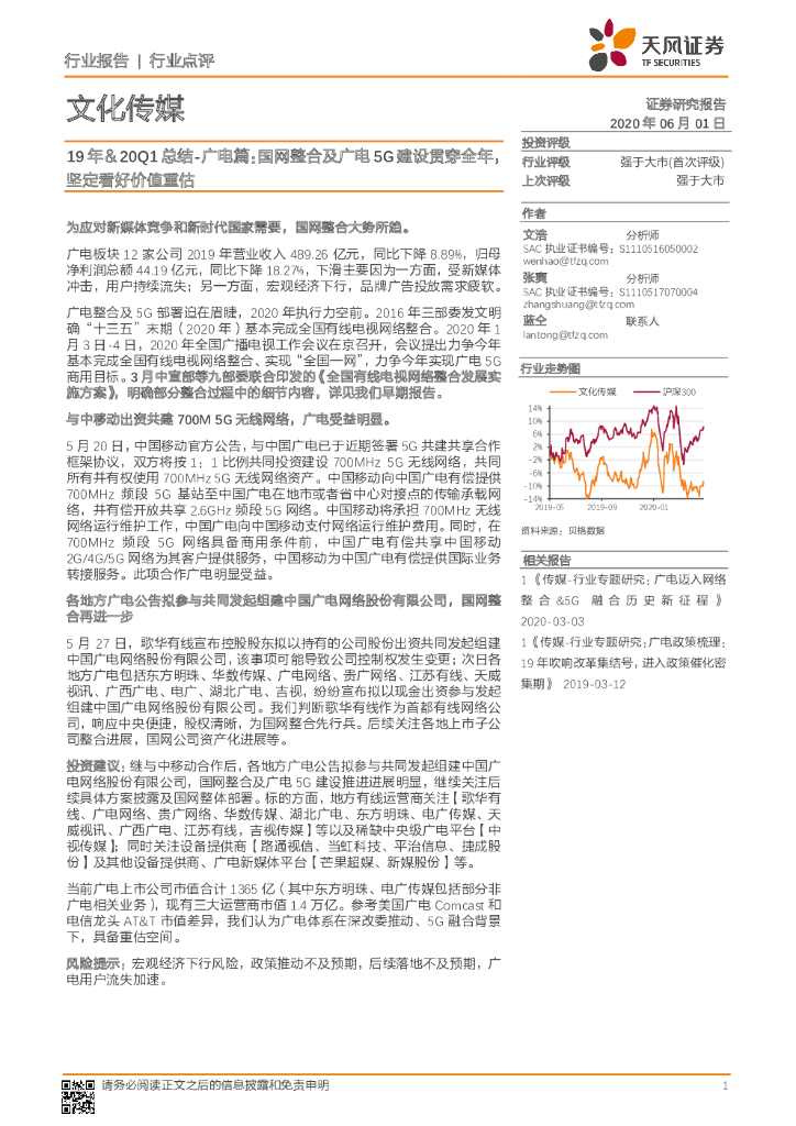天风证券:文化传媒19年&20Q1总结-广电篇:国网整合及广电5G建设贯穿全年,坚定看好价值重估.pdf