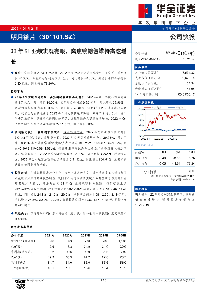华金证券:明月镜片(301101)-23年Q1业绩表现亮眼,离焦镜销售维持高速增长23年Q1业绩表现亮眼,离焦镜销售维持高速增长.pdf