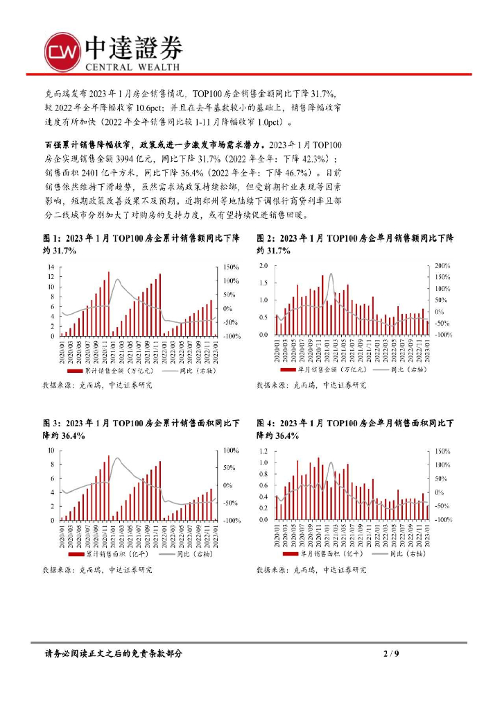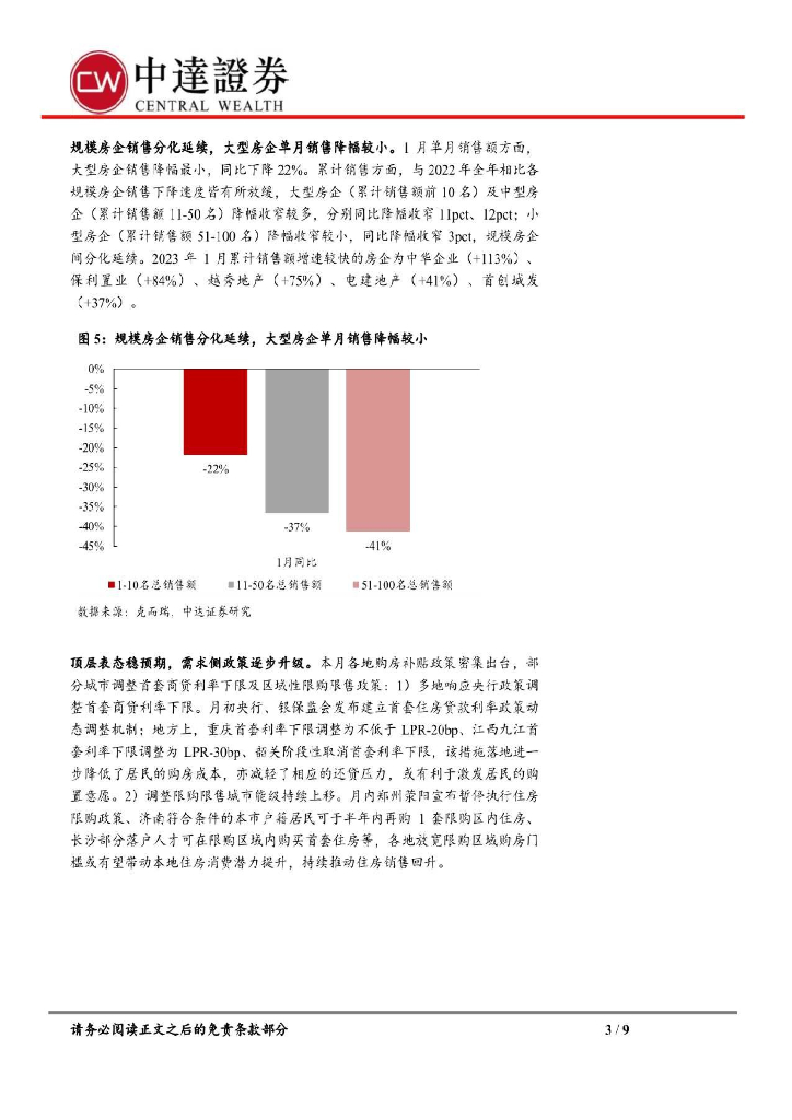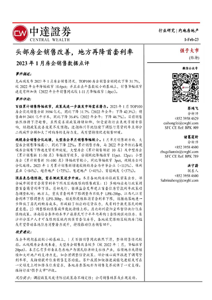 中达证券投资:2023年1月房企销售数据点评:头部房企销售改善,地方再降首套利率.pdf