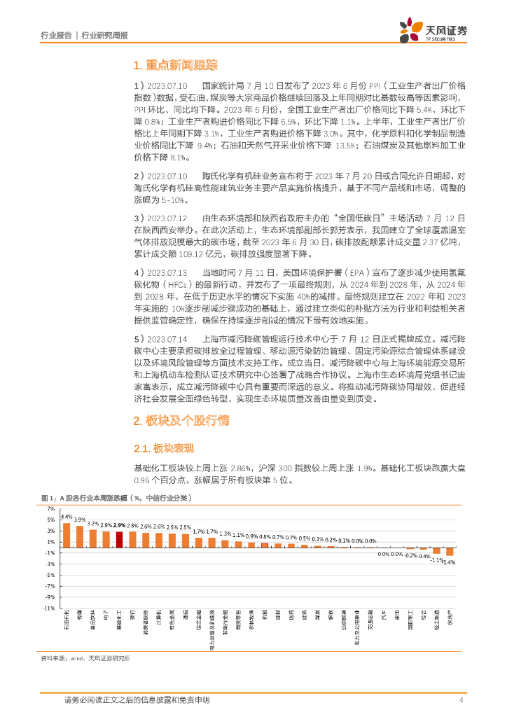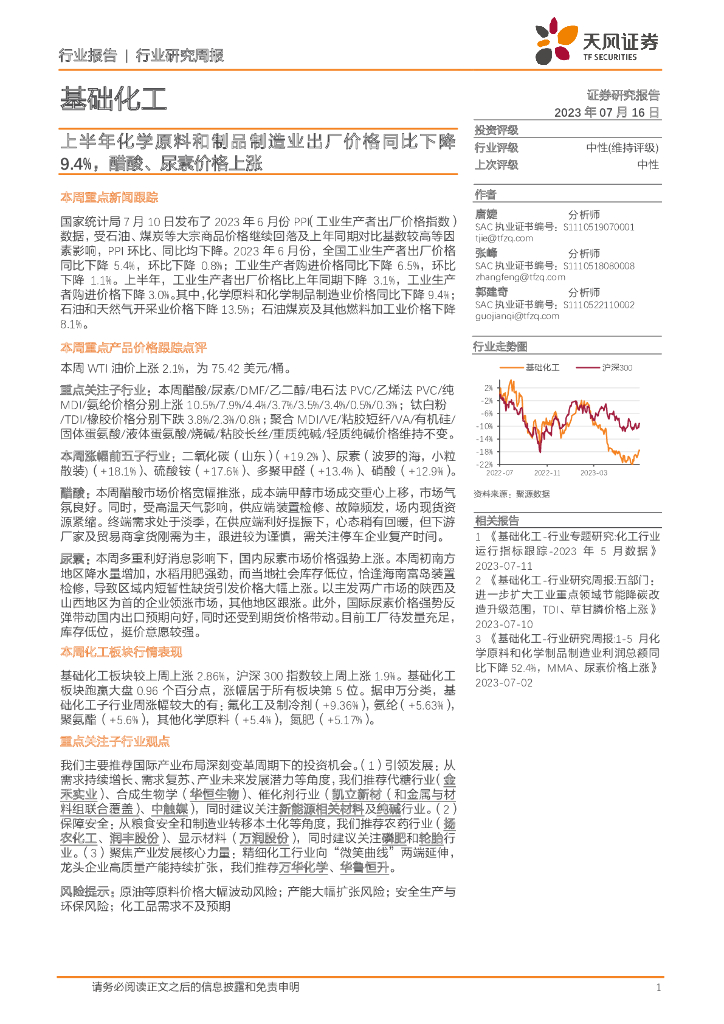 天风证券:基础化工行业研究周报:上半年化学原料和制品制造业出厂价格同比下降9.4%,醋酸、尿素价格上涨.pdf