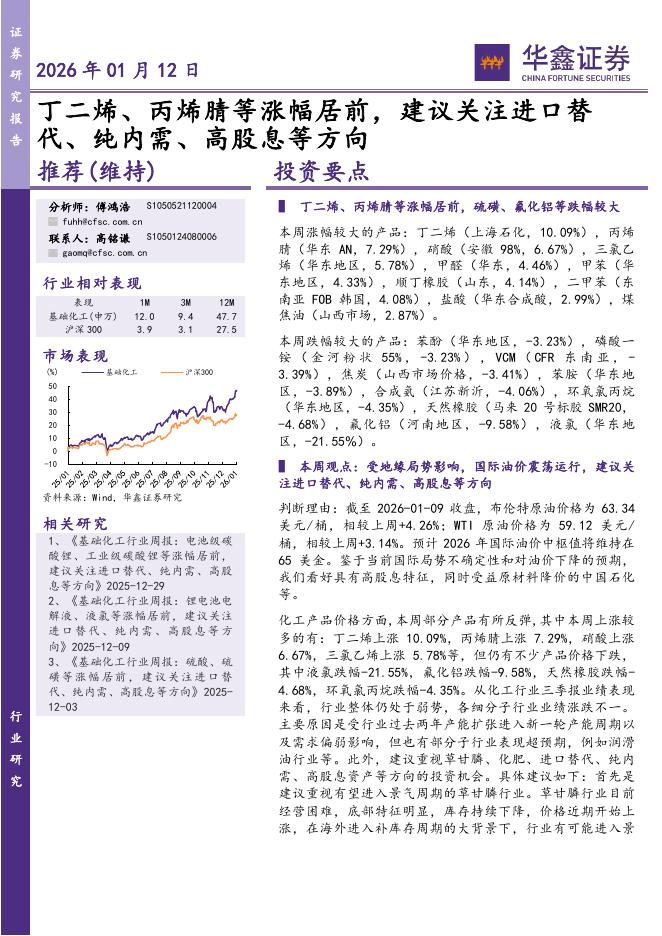 华鑫证券:化工行业研究:丁二烯、丙烯腈等涨幅居前,建议关注进口替代、纯内需、高股息等方向.pdf