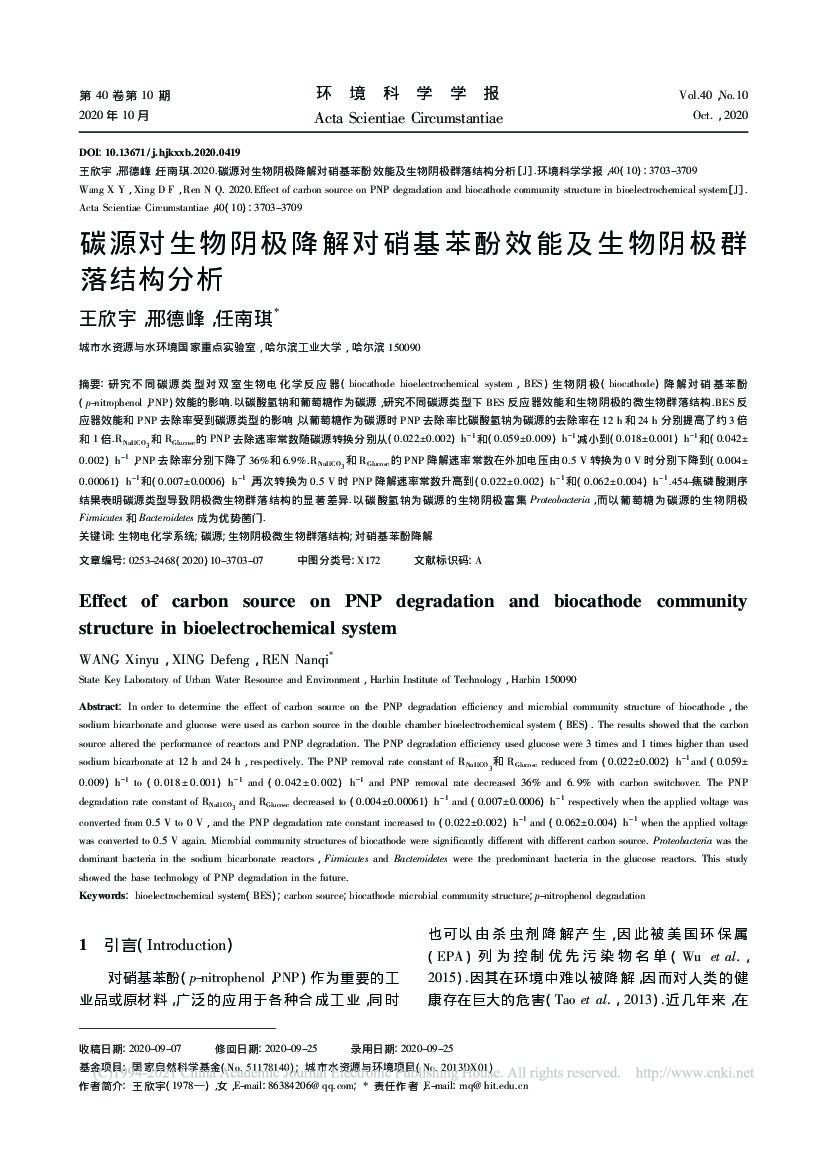 哈尔滨工业大学:碳源对生物阴极降解对硝基苯酚效能及生物阴极群落结构分析.pdf