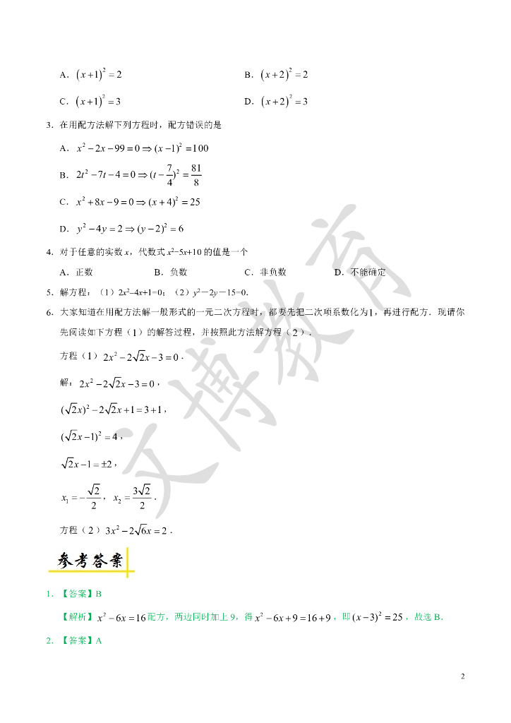 ——中考班寒假数学典题精炼02解一元二次方程配方法.pdf