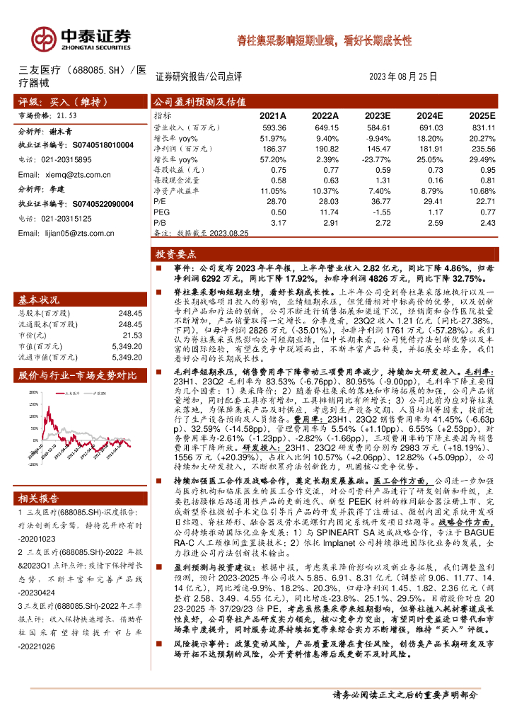 中泰证券:三友医疗(688085)-脊柱集采影响短期业绩,看好长期成长性.pdf