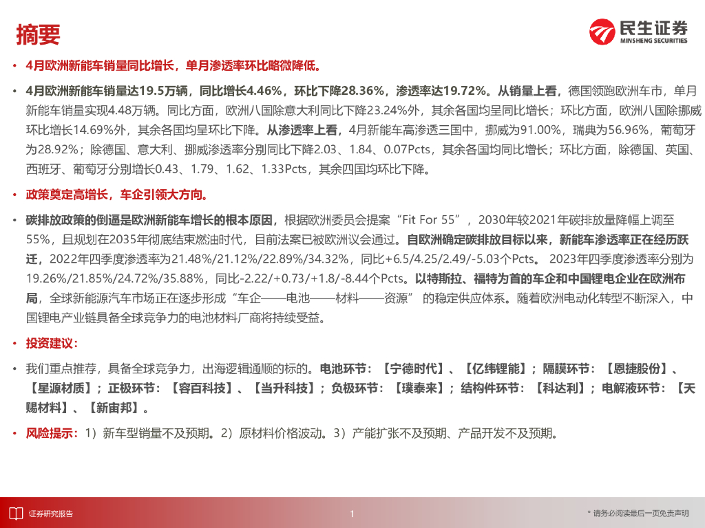 民生证券:EV观察系列163:4月欧洲新能车市场同比增长,单月渗透率环比降低.pdf