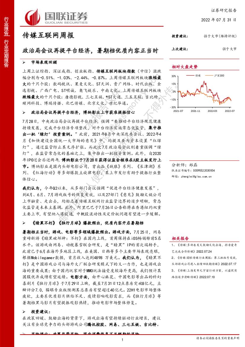 国联证券:传媒互联网周报:政治局会议再提平台经济,暑期档优质内容正当时.pdf